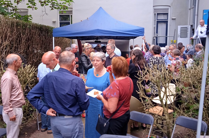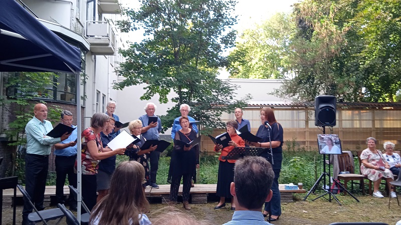 Op 9 september hielden haar vrienden een afscheidsbijeenkomst in de tuin van Tante Nino, een buurtcentrum waar Ita al jaren nauw bij betrokken was. Goed georganiseerd en anticiperend op allerlei situaties – zo kennen velen van ons haar ook – heeft ze de wens opgeschreven dat er bij haar afscheid veel toespraken en veel muziek zouden klinken. Wegens de coronabeperkingen was er bij de bijeenkomst slechts ruimte voor 100 bezoekers. Panchanter mocht met 16 oud-leden onder leiding van dirigent Wim van Herk twee van onze ’tophits’ zingen: The Shower (Elgar) en Ubi Caritas (Duruflé).