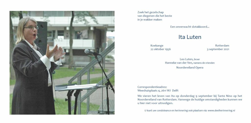 Wat een intens en verdrietig bericht over het overlijden van Ita! Toen Ita is overleden, was ik in Zwitserland op vakantie. Die betreffende woensdag had ik een lange tocht gemaakt naar een top, die ‘Le Chevalier’ wordt genoemd. Dat betekent ‘De ruiter’ en erachter ligt een lange rug, ‘het paard’. Voor mij was jij een aanvoerder, een ruiter die het paard bestuurde. En terwijl ik, na genoten te hebben van het bijna bovenaardse fenomenale uitzicht daar, weer afdaalde naar de bewoonde wereld, nam jij een aantal uren later een sprong in het mysterie. Heel veel sterkte voor jullie allemaal, met het plotselinge verlies van zo’n goede, dierbare vriendin en markante persoonlijkheid. In liefde en muziek verbonden, Klazien